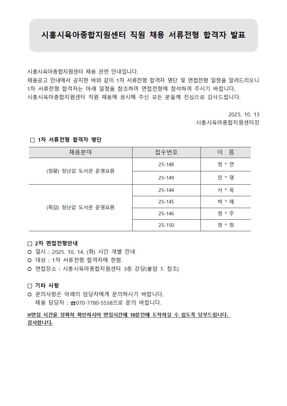 [ä¿ë]½ÃÈï½ÃÀ°¾ÆÁ¾ÇÕÁö¿ø¼¾ÅÍ Á÷¿ø 1Â÷ ¼·ùÀüÇü ÇÕ°ÝÀÚ °ø°í(Àå³°¨ µµ¼°ü ¿î¿µ¿ä¿ø-Á¤¿ÕÁ¡, ¸ñ°¨Á¡)