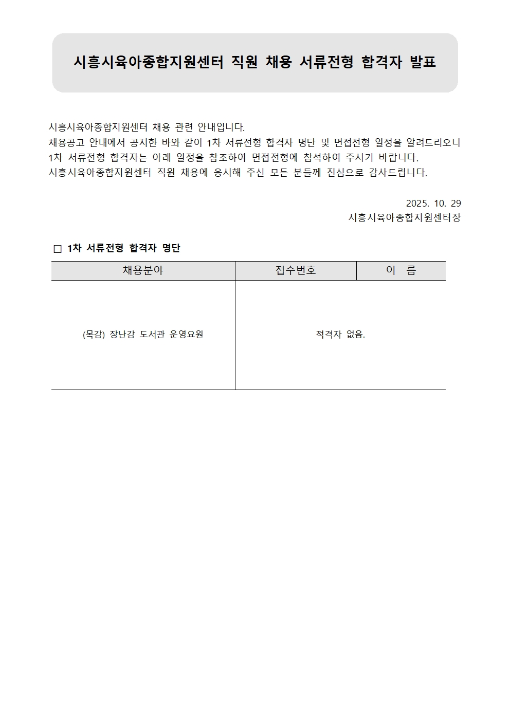 [ä¿ë]½ÃÈï½ÃÀ°¾ÆÁ¾ÇÕÁö¿ø¼¾ÅÍ Á÷¿ø 1Â÷ ¼·ùÀüÇü ÇÕ°ÝÀÚ °ø°í(Àå³°¨ µµ¼°ü ¿î¿µ¿ä¿ø-¸ñ°¨Á¡)