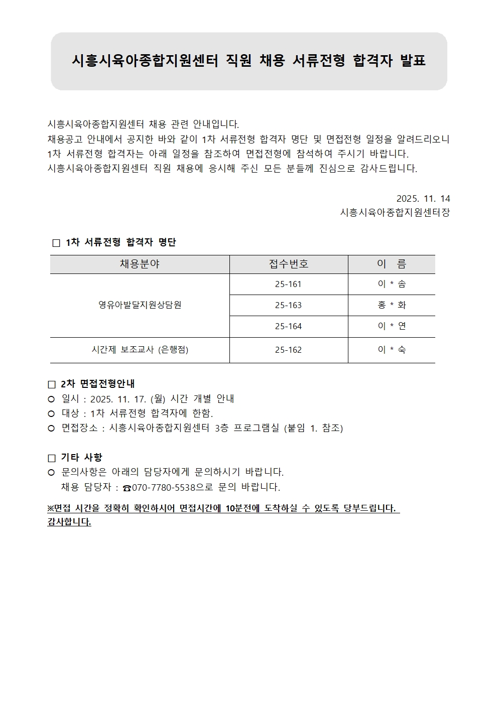 [ä¿ë]½ÃÈï½ÃÀ°¾ÆÁ¾ÇÕÁö¿ø¼¾ÅÍ Á÷¿ø 1Â÷ ¼·ùÀüÇü ÇÕ°ÝÀÚ °ø°í(¿µÀ¯¾Æ¹ß´ÞÁö¿ø»ó´ã¿ø, ½Ã°£Á¦º¸Á¶±³»ç-ÀºÇàÁ¡)