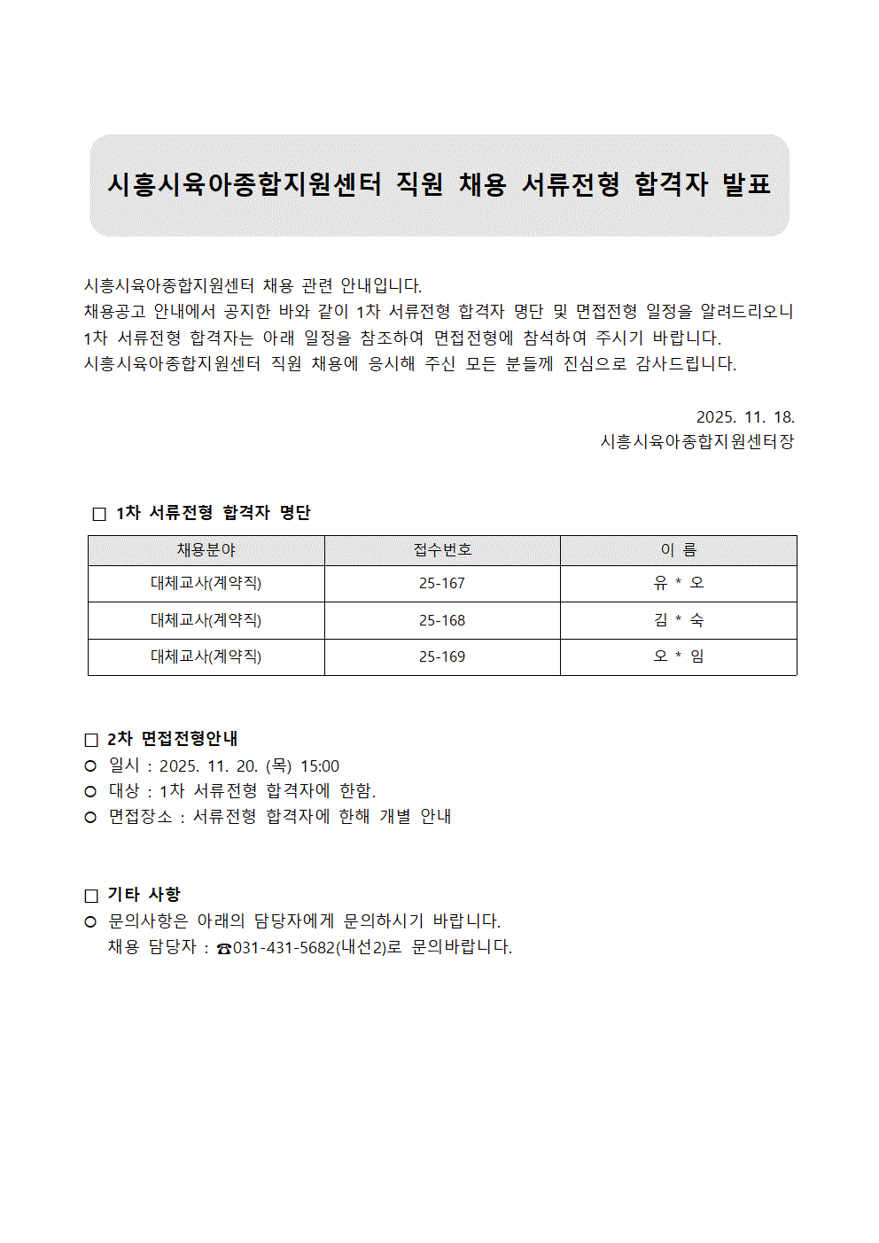 [ä¿ë]½ÃÈï½ÃÀ°¾ÆÁ¾ÇÕÁö¿ø¼¾ÅÍ Á÷¿ø 1Â÷ ¼·ùÀüÇü ÇÕ°ÝÀÚ °ø°í(´ëü±³»ç)