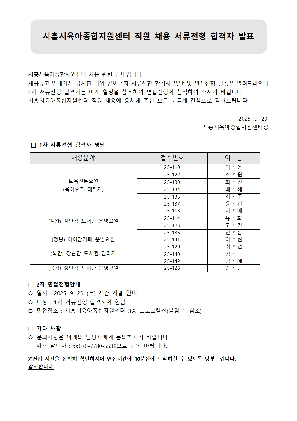 [ä¿ë]½ÃÈï½ÃÀ°¾ÆÁ¾ÇÕÁö¿ø¼¾ÅÍ Á÷¿ø 1Â÷ ¼·ùÀüÇü ÇÕ°ÝÀÚ °ø°í(º¸À°Àü¹®¿ä¿ø, Àå³°¨µµ¼°ü ¿î¿µ¿ä¿ø, ¾ÆÀ̸¾Ä«Æä ¿î¿µ¿ä¿ø, Àå³°¨µµ¼°ü °ü¸®ÀÚ)
