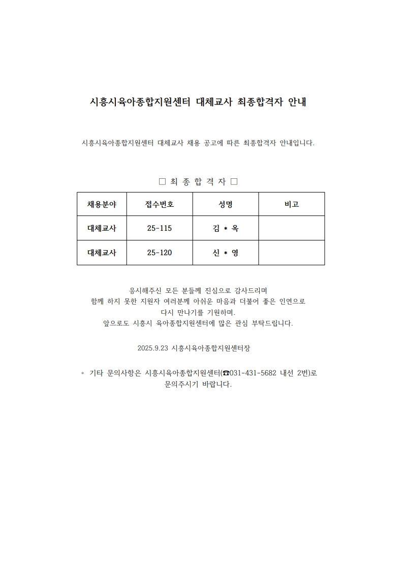 [°ø°í]½ÃÈï½ÃÀ°¾ÆÁ¾ÇÕÁö¿ø¼¾ÅÍ ÃÖÁ¾ÇÕ°ÝÀÚ °ø°í(´ëü±³»ç)