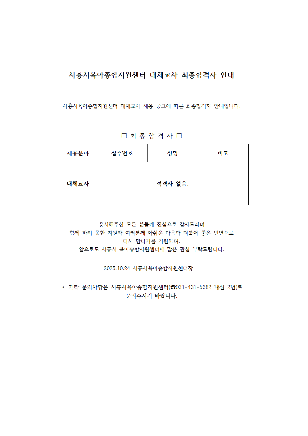 [°ø°í]½ÃÈï½ÃÀ°¾ÆÁ¾ÇÕÁö¿ø¼¾ÅÍ ÃÖÁ¾ÇÕ°ÝÀÚ °ø°í(´ëü±³»ç)