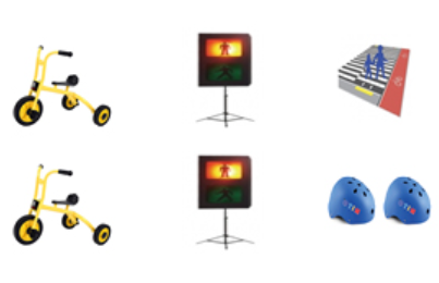 | 보행 신호등 2대, 횡단보도 매트 1개, 영아용 하페 네발 자전거 2대, 헬맷 2개 |