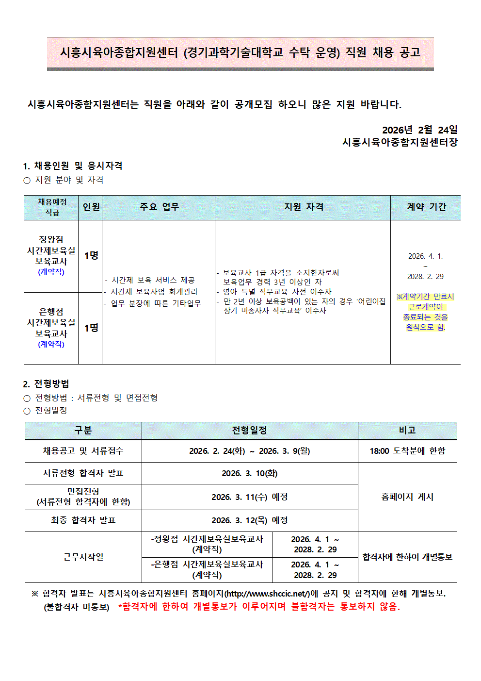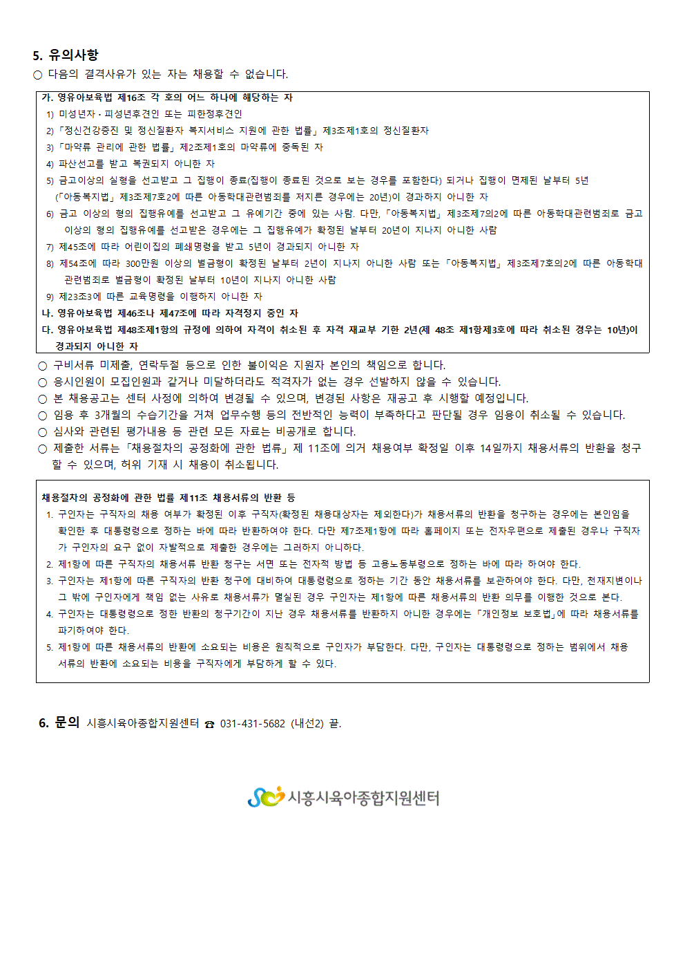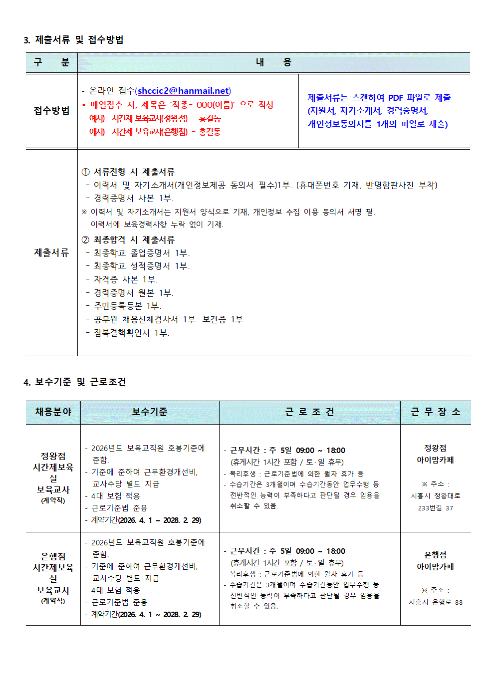 [센터] [채용]시흥시육아종합지원센터 직원 (시간제보육교사 - 정왕점,은행점 )채용 공고