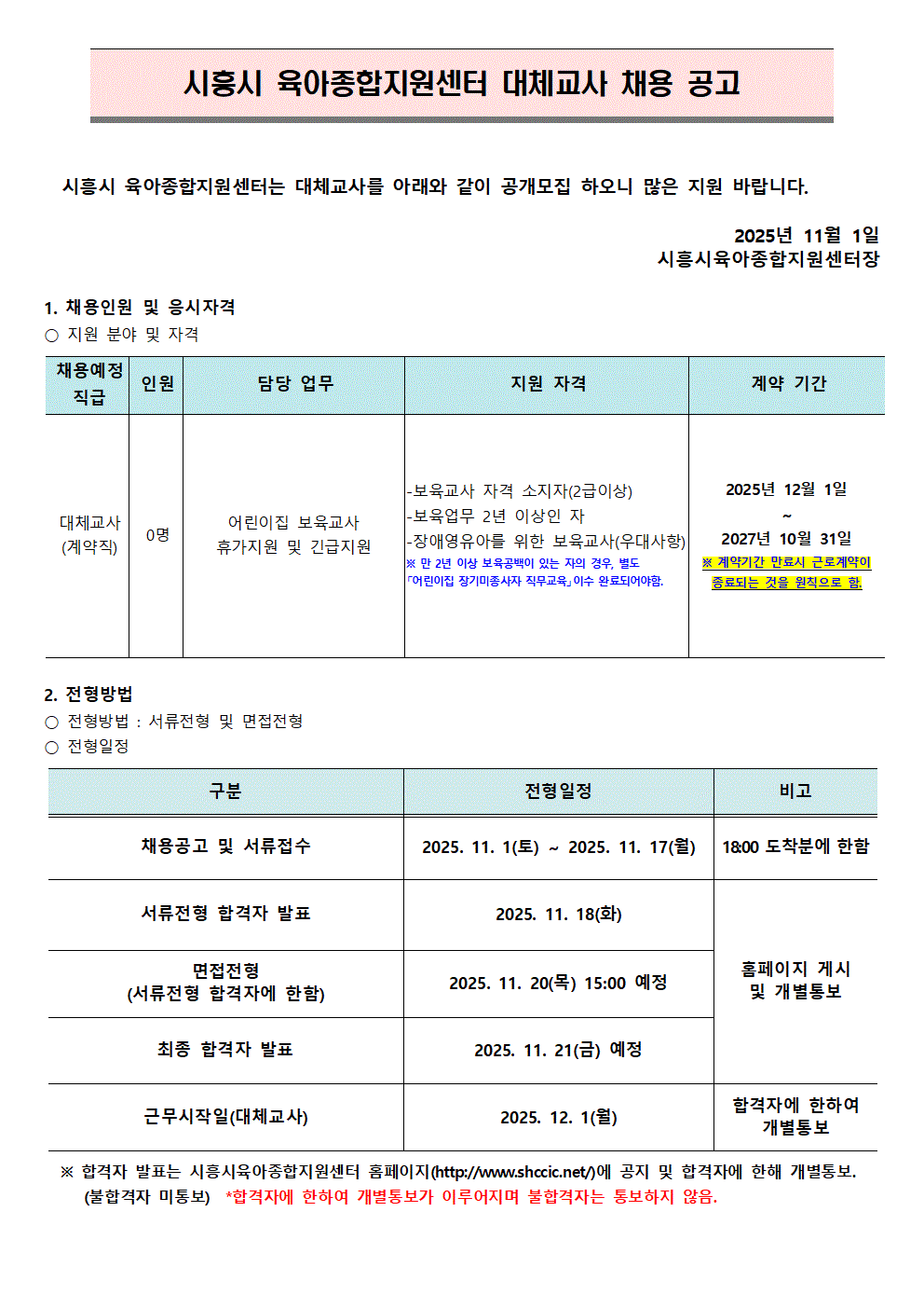 [센터] [채용]시흥시육아종합지원센터 직원(대체교사) 모집 공고