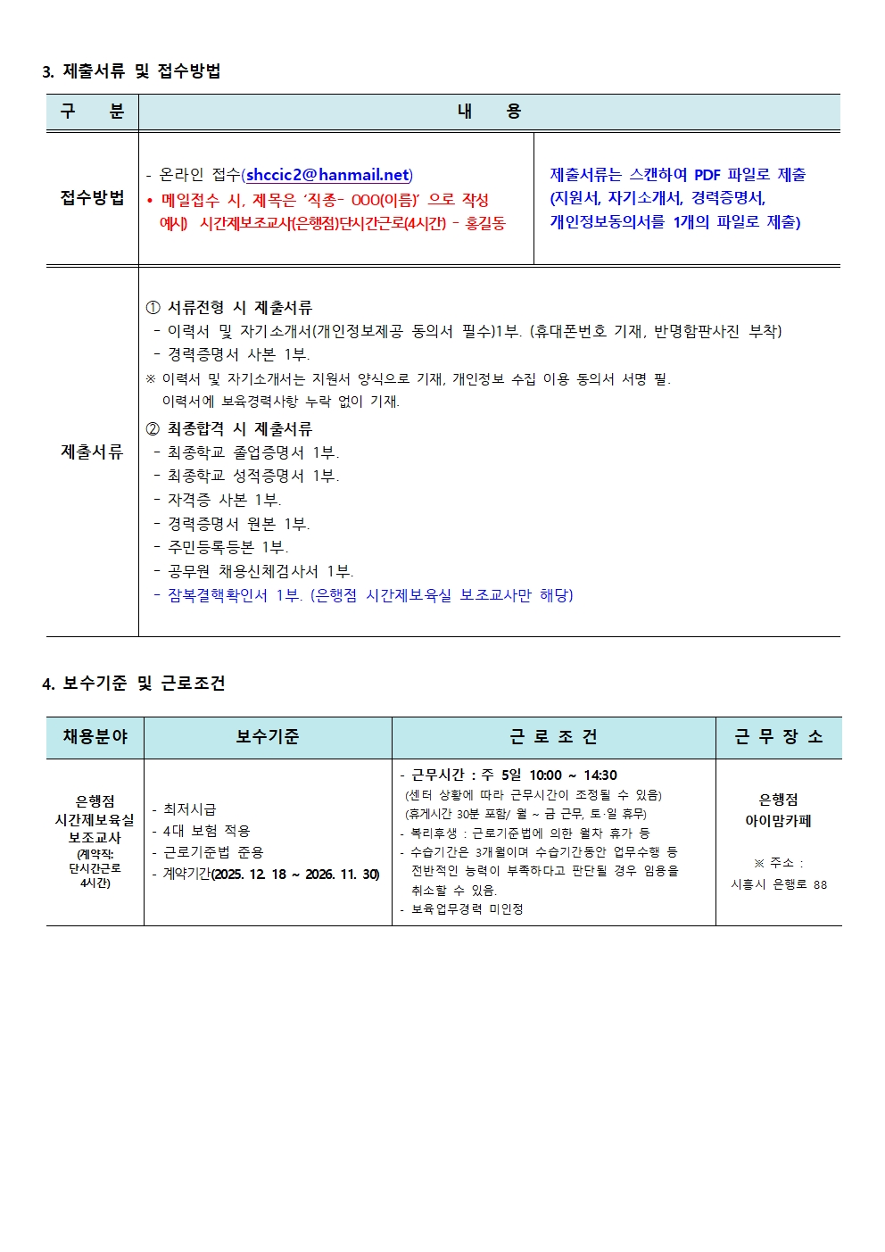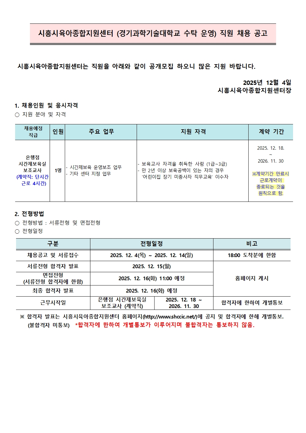 [센터] [채용]시흥시육아종합지원센터 직원 채용(시간제보조교사-은행점)