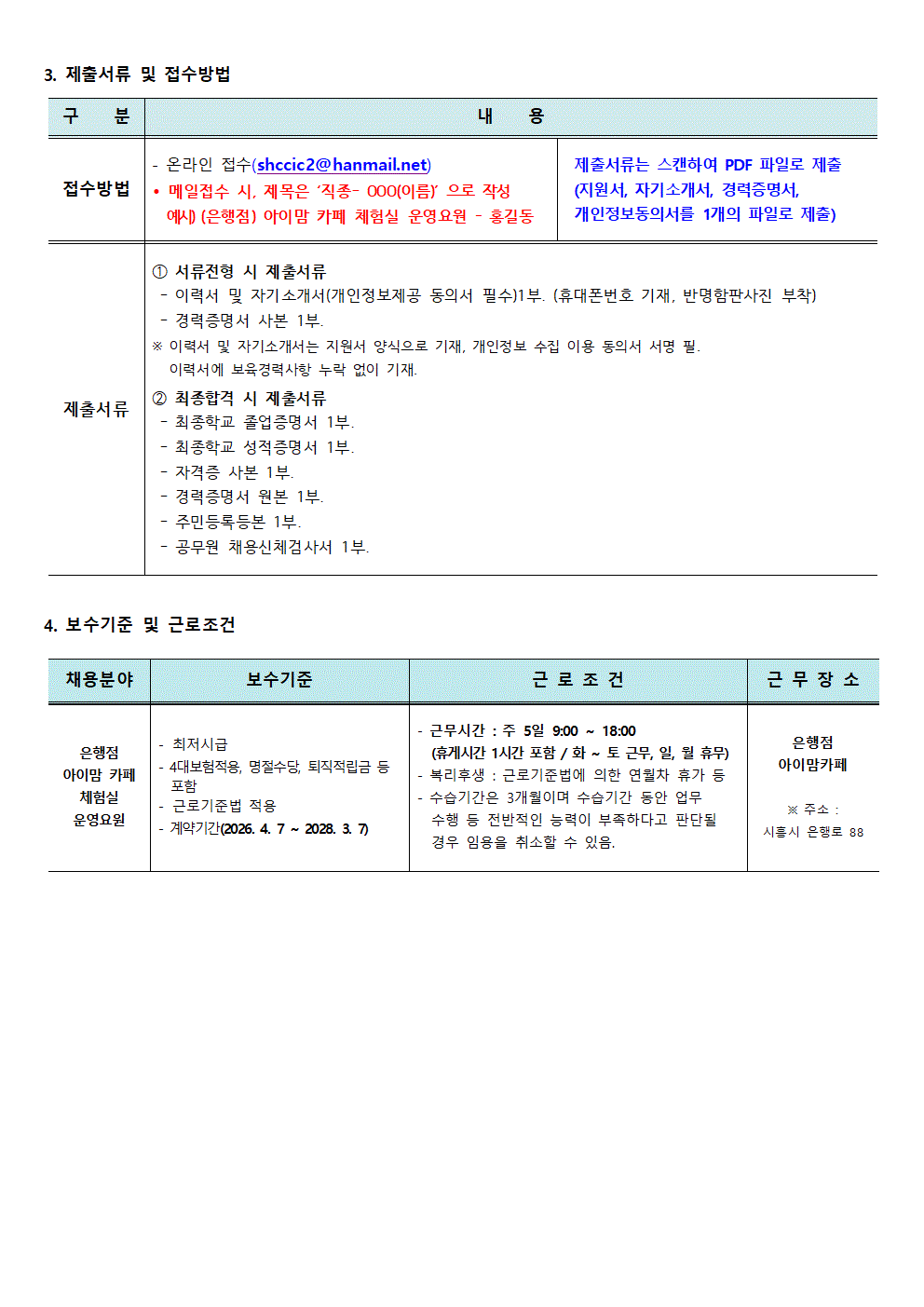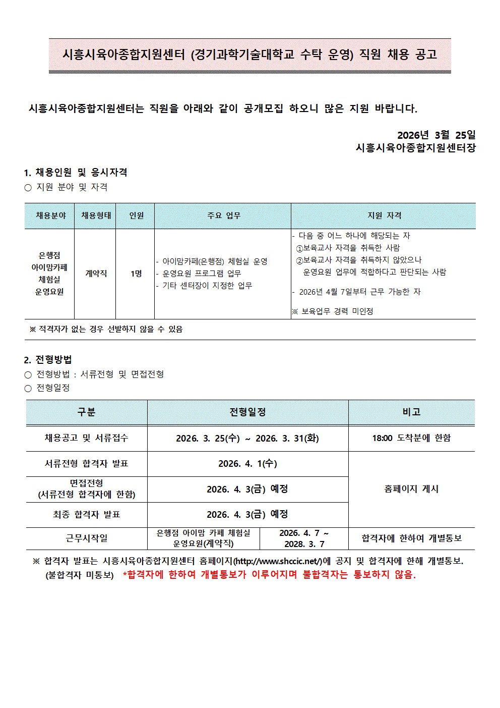 [센터] [채용]시흥시육아종합지원센터 직원 (아이맘카페 체험실 운영요원 - 은행점 )채용 재 공고