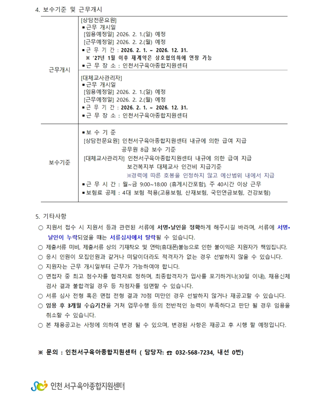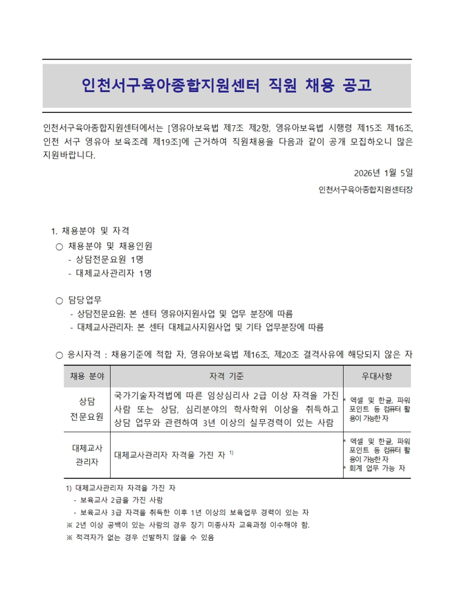 [외부] [채용]인천서구육아종합지원센터 직원 채용 공고