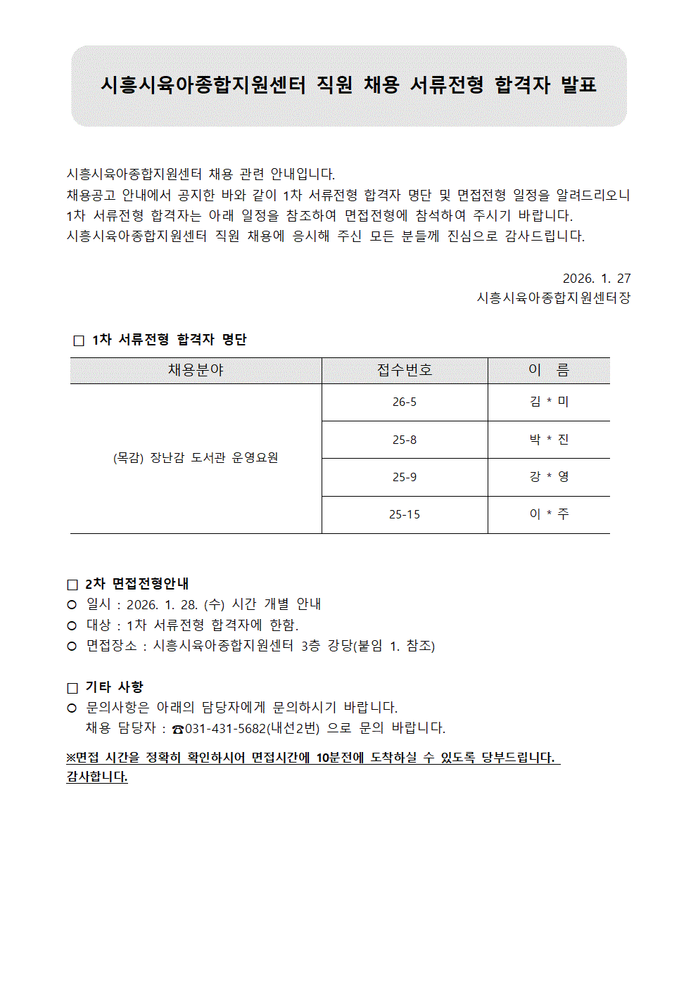 [센터] [채용]시흥시육아종합지원센터 직원 1차 서류전형 합격자 공고(목감점 - 장난감도서관 운영요원)