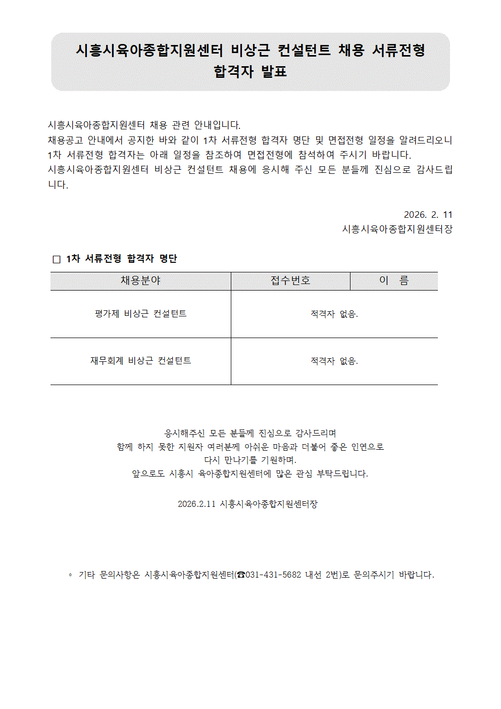 [센터] 시흥시육아종합지원센터 1차 서류전형 합격자 공고 ( 평가제 비상근 컨설턴트, 재무회계 비상근 컨설턴트)