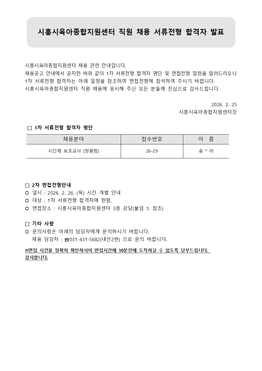 [센터] [채용]시흥시육아종합지원센터 직원 1차 서류전형 합격자 공고(정왕점- 시간제보조교사)