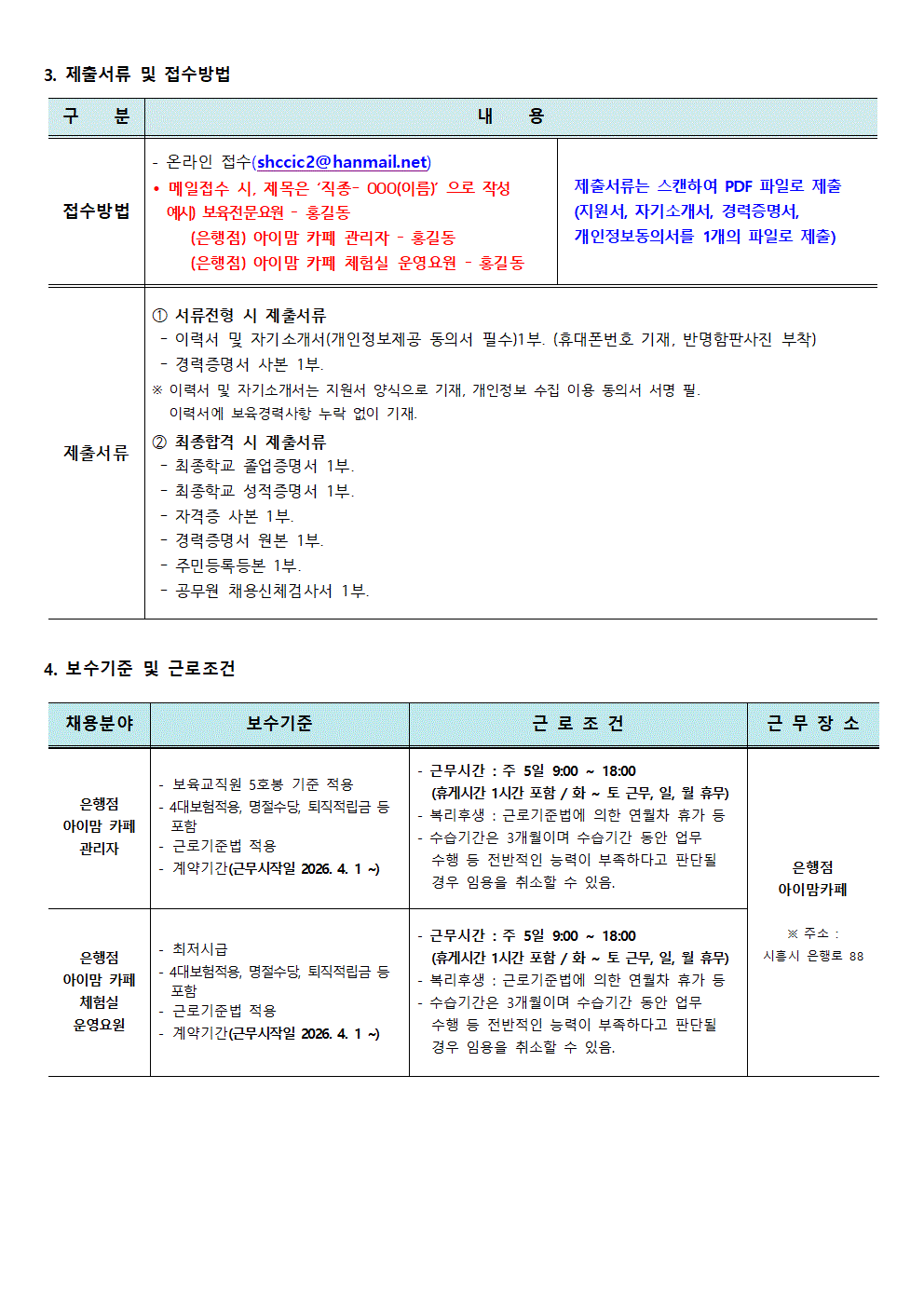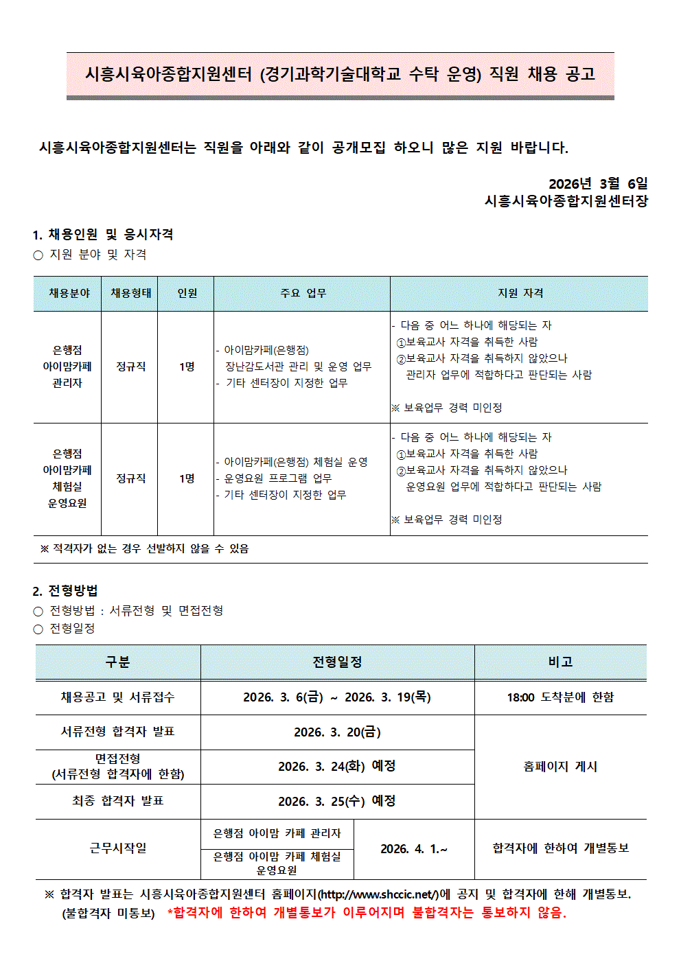 [센터] [채용]시흥시육아종합지원센터 직원 (아이맘카페 관리자, 아이맘카페 체험실 운영요원 - 은행점 )채용 공고