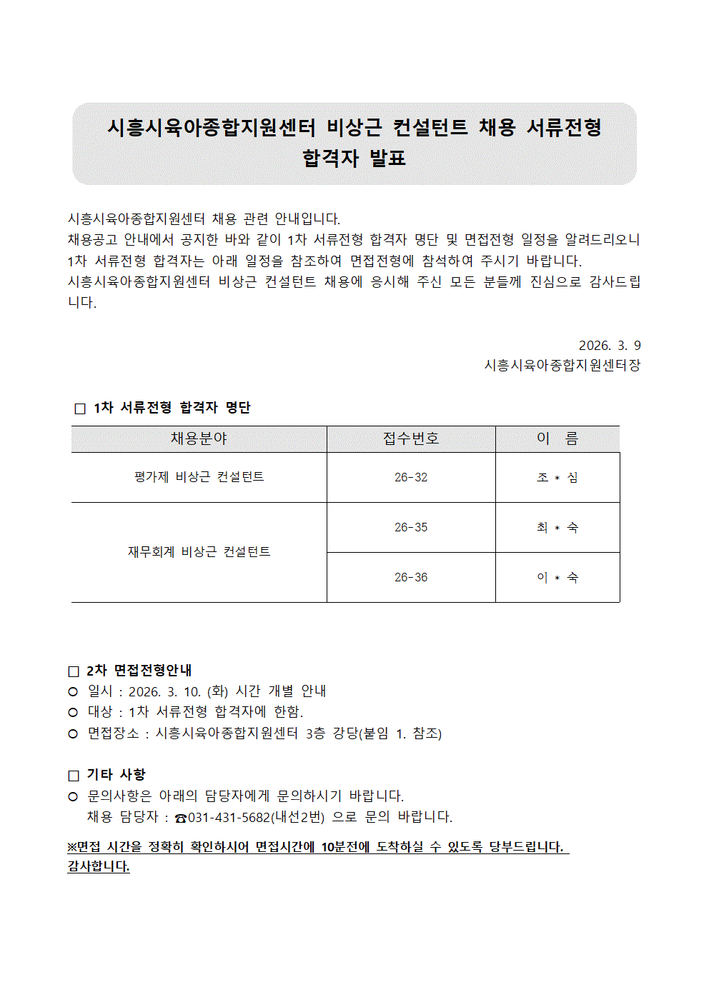 [센터] [채용]시흥시육아종합지원센터 직원 1차 서류전형 합격자 공고(비상근 컨설턴트)