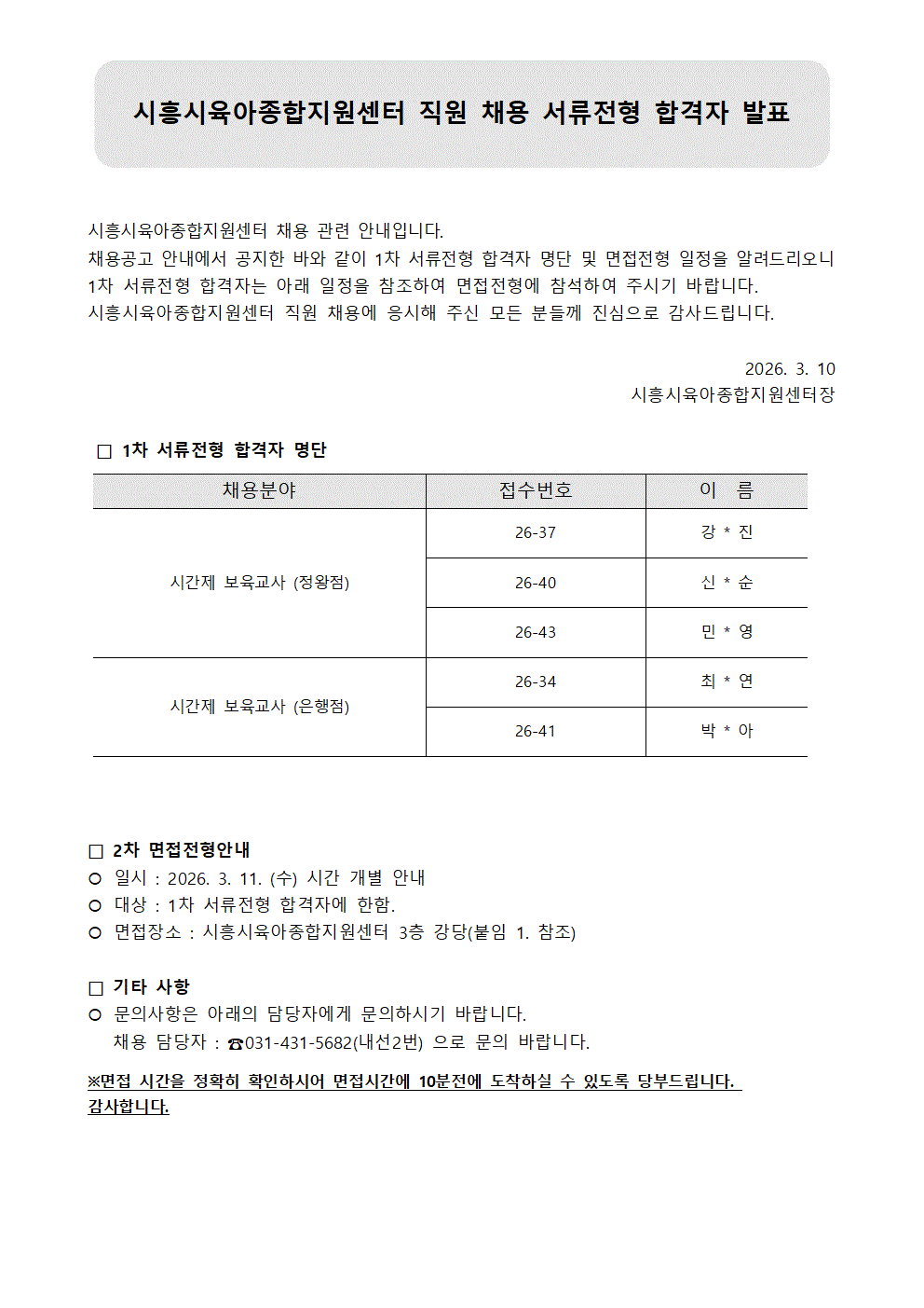 [센터] [채용]시흥시육아종합지원센터 직원 1차 서류전형 합격자 공고(시간제보육교사 - 정왕점, 은행점)
