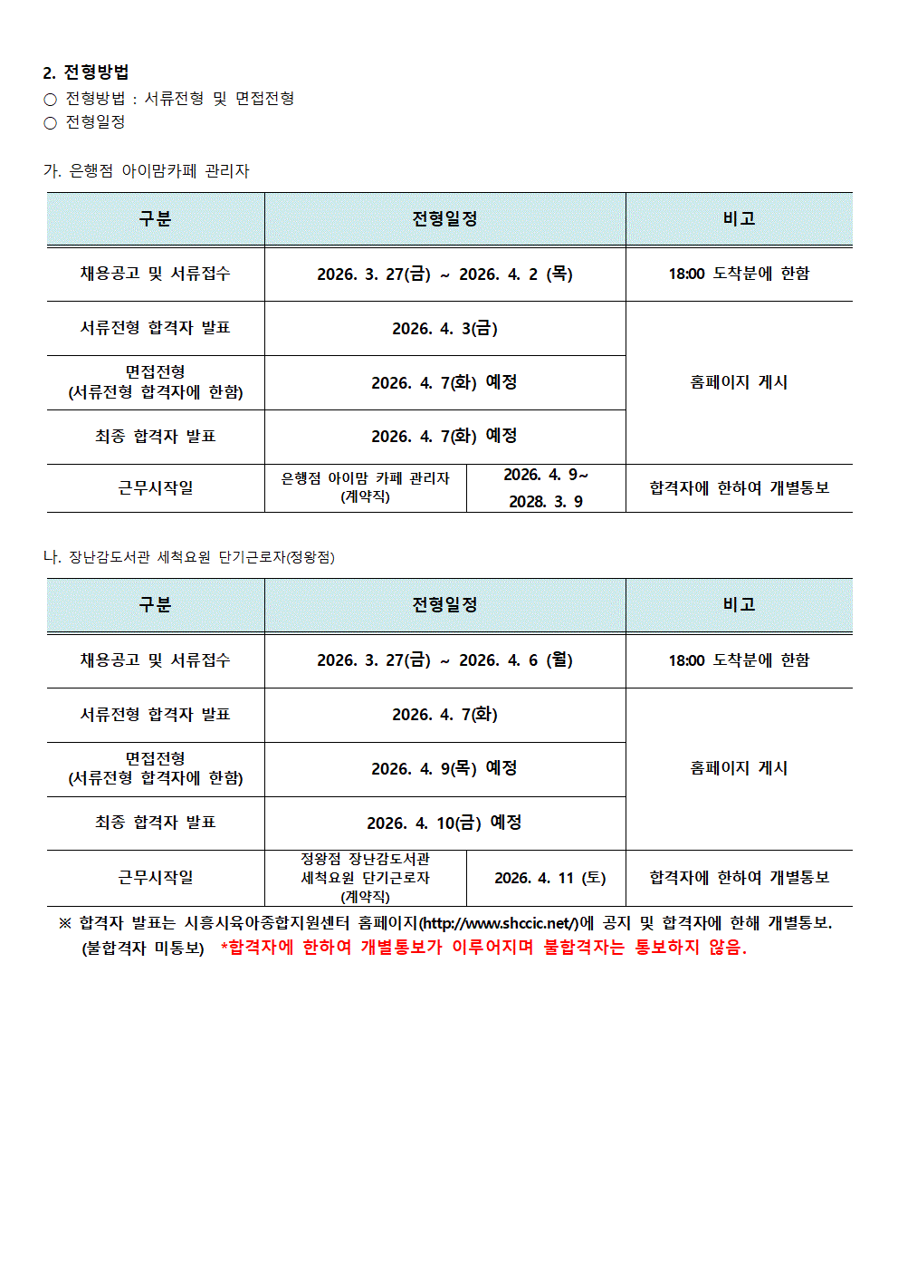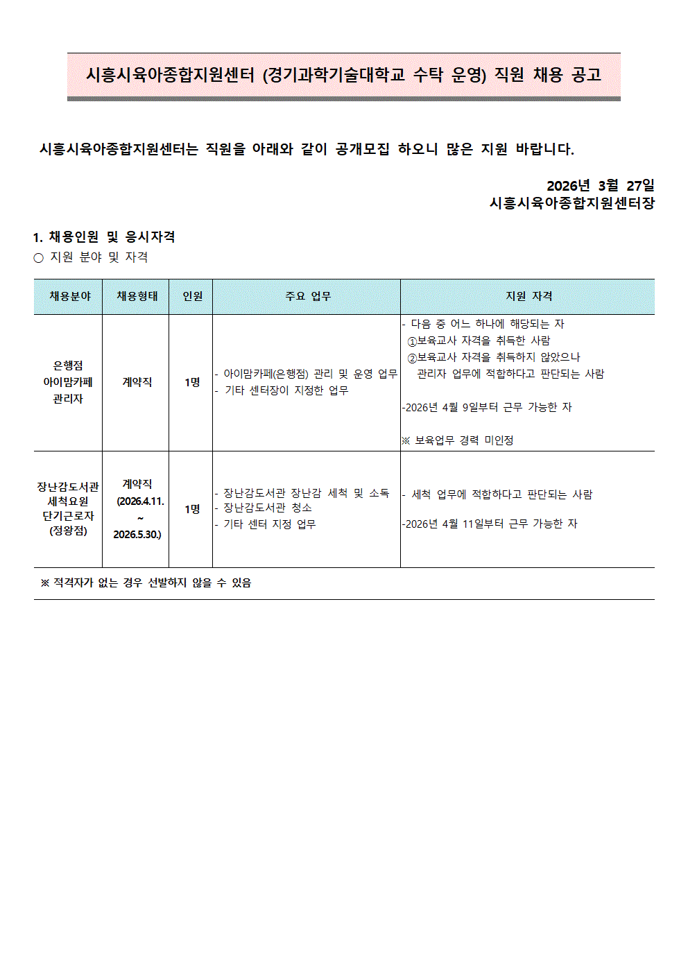[센터] [채용]시흥시육아종합지원센터 직원 (아이맘카페 관리자 - 은행점, 장난감도서관 세척요원 - 정왕점 )채용 공고