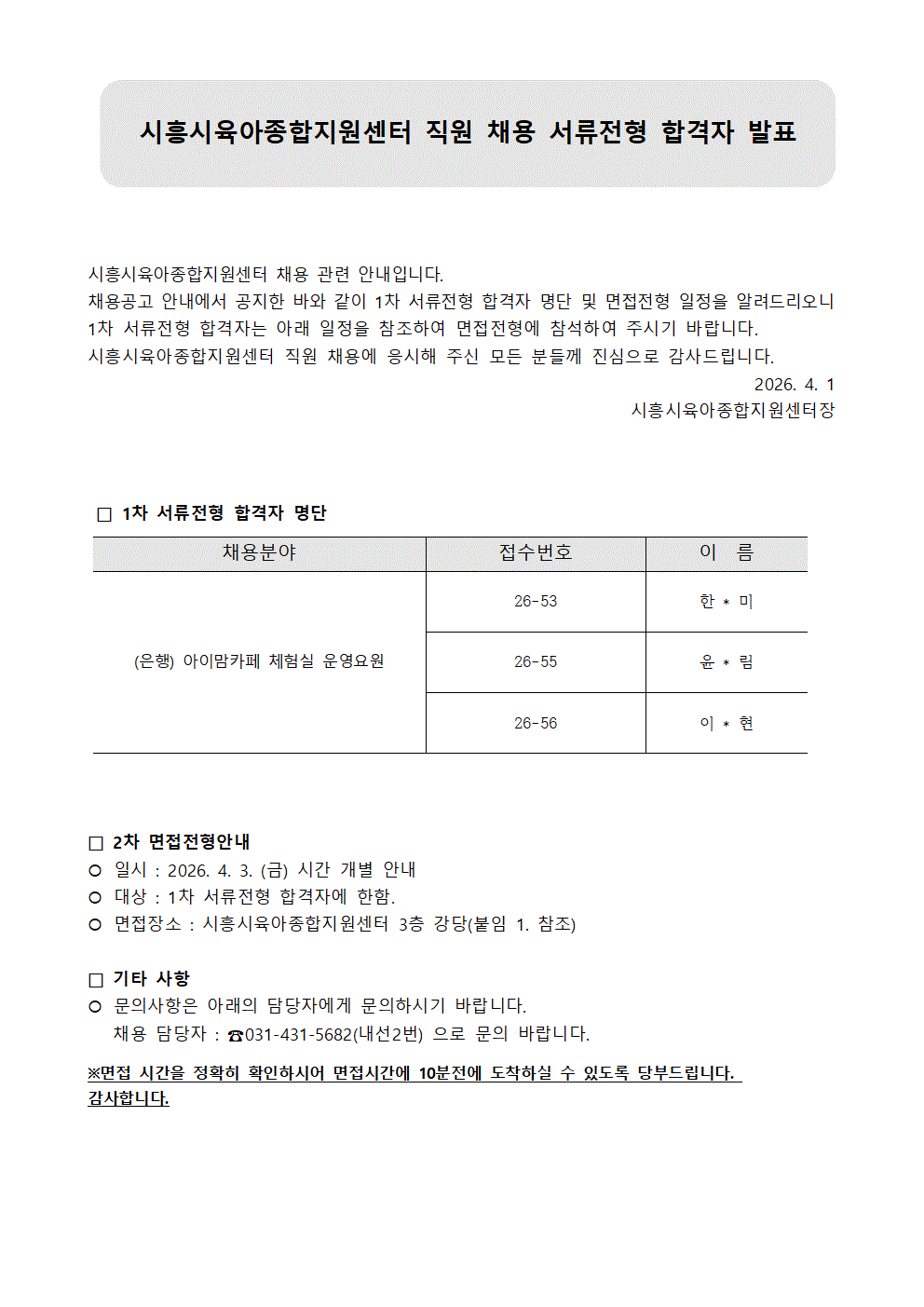 [센터] [채용]시흥시육아종합지원센터 직원 1차 서류전형 합격자 공고(은행점- 아이맘카페 체험실 운영요원)