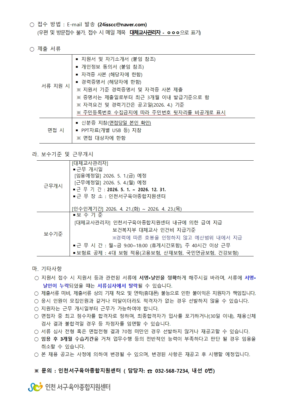[외부] [채용] 인천서구육아종합지원센터 직원 채용 공고