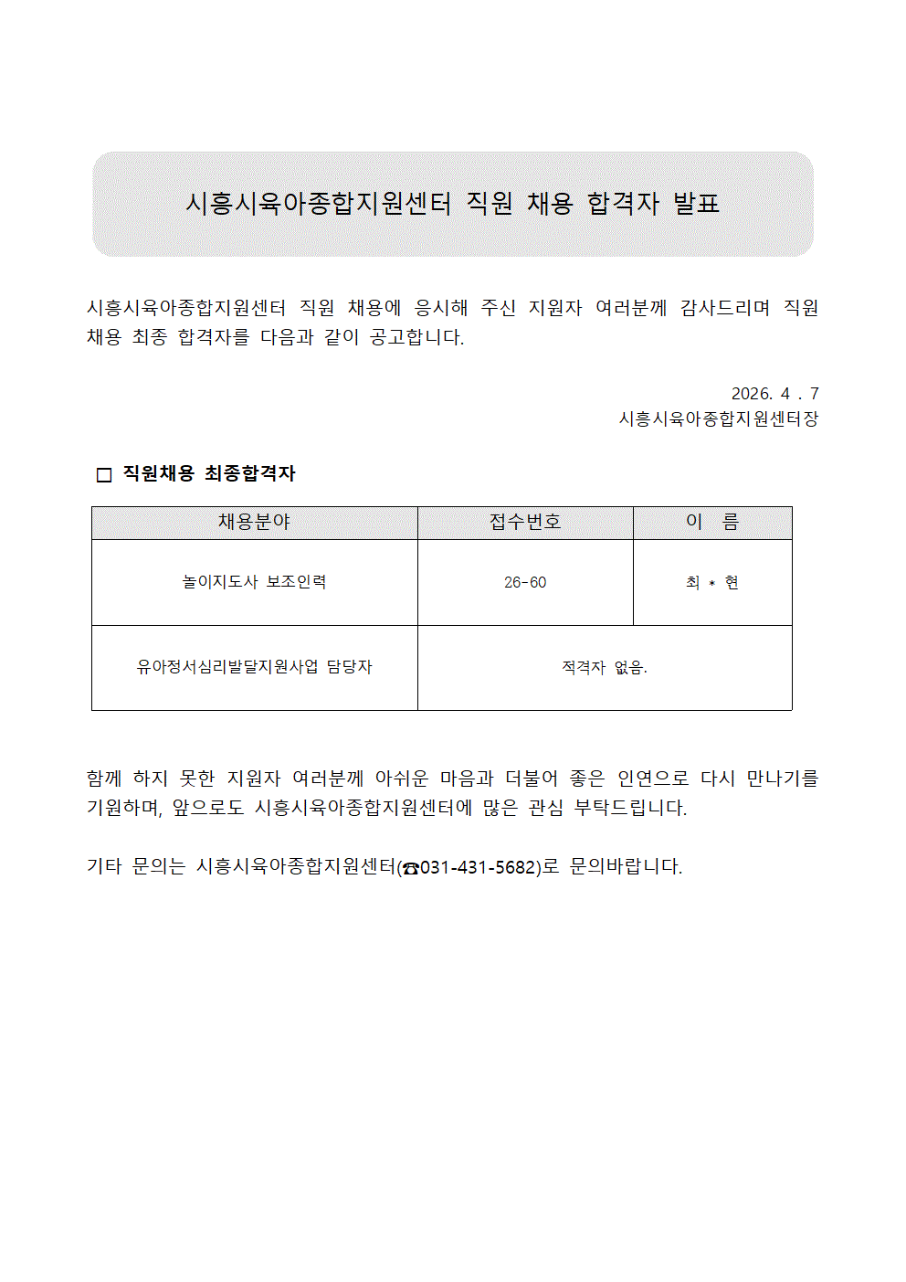 [센터] [채용]시흥시육아종합지원센터 직원 최종합격자 공고(놀이지도사 보조인력, 유아정서심리발달지원사업 담당자)