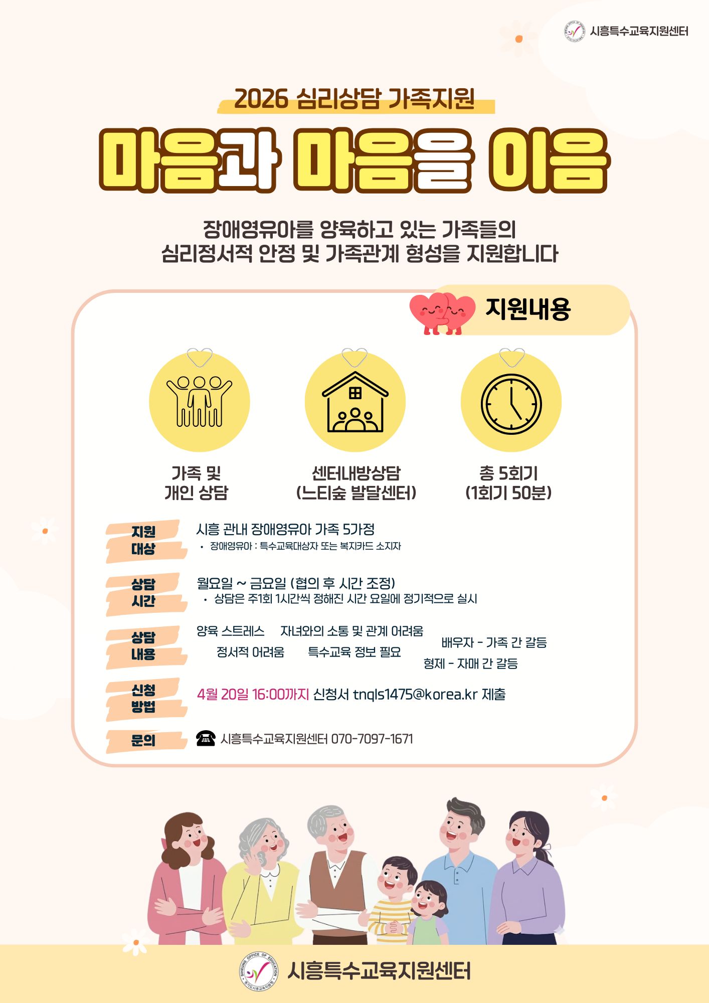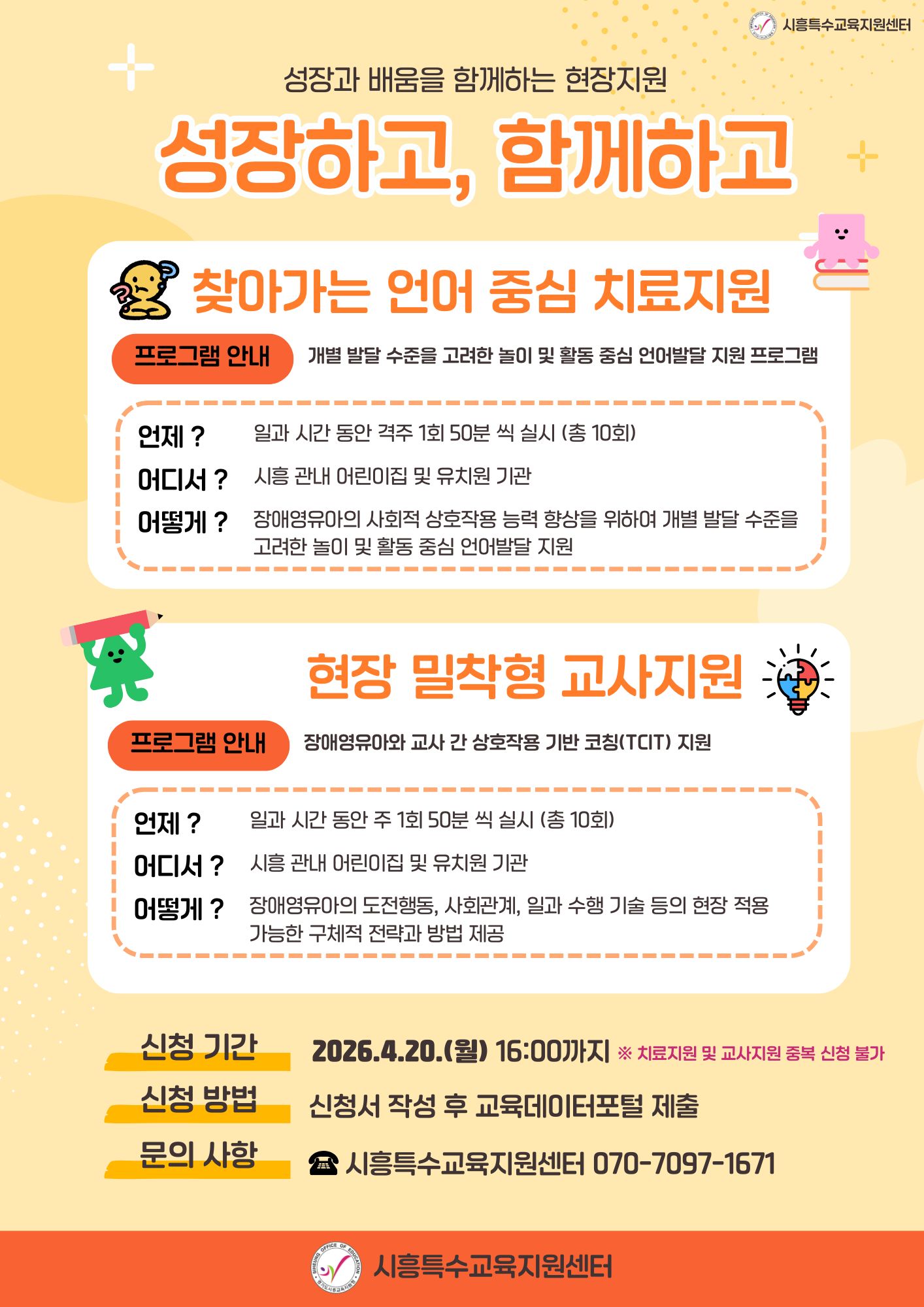 안녕하십니까? 경기도시흥교육지원청 특수교육지원센터에서 진행하는 장애영유아를 양육하는 가정을 위한 가족 상담, 치료 지원, 교사 지원 프로그램을 안내드리니 많은 관심 부탁드립니다.
