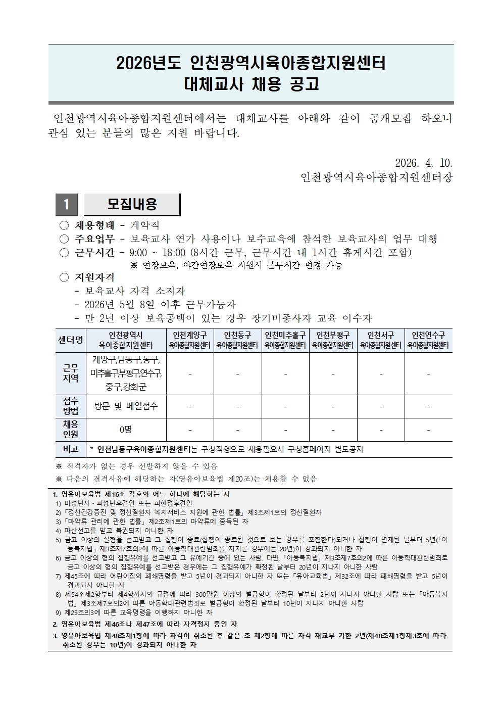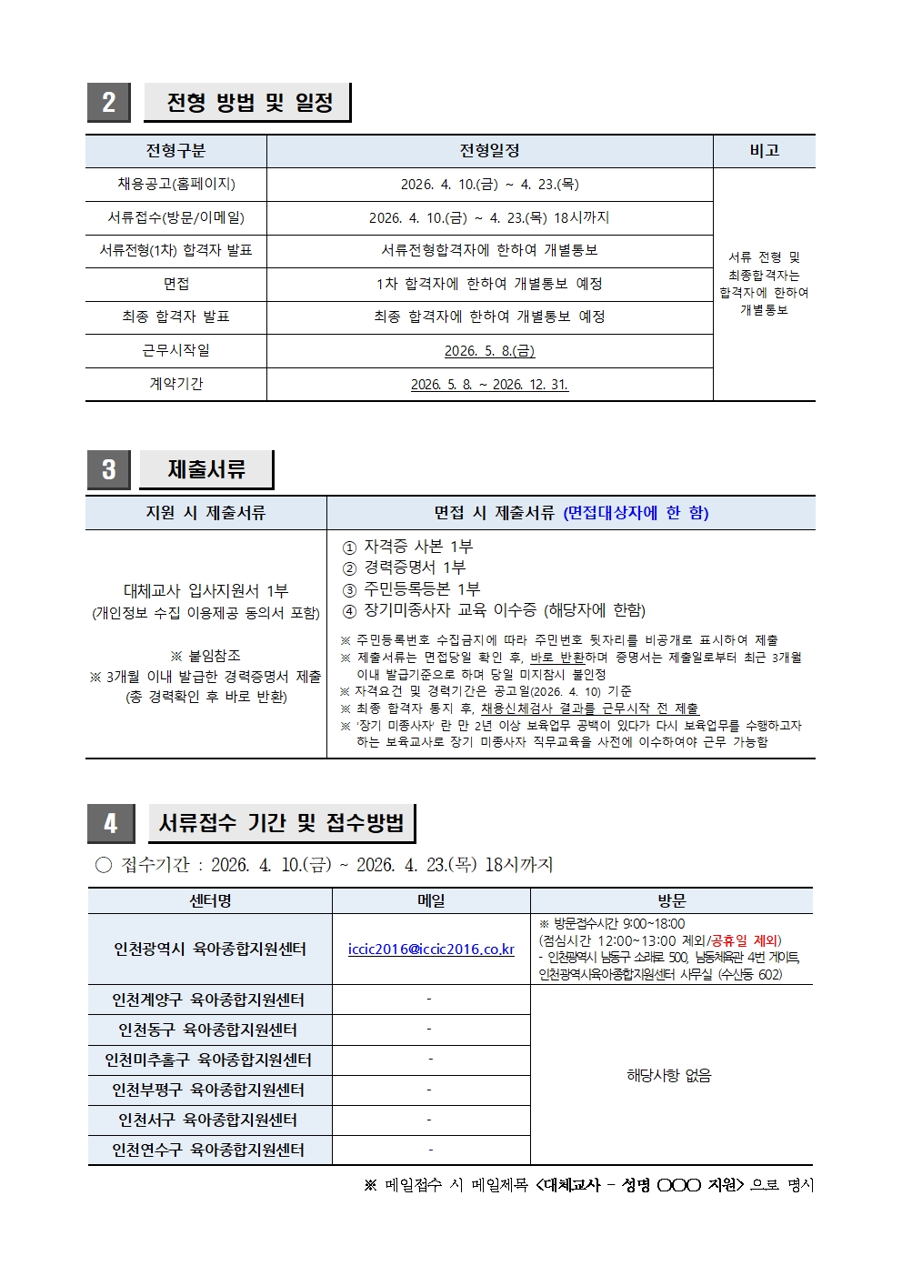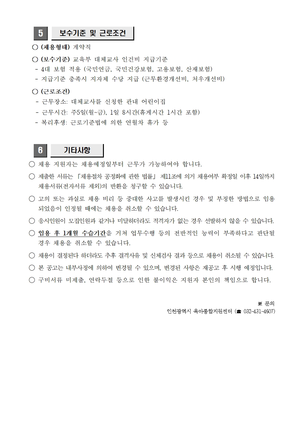 [외부] [채용] 인천광역시 육아종합지원센터 대체교사 채용 공고