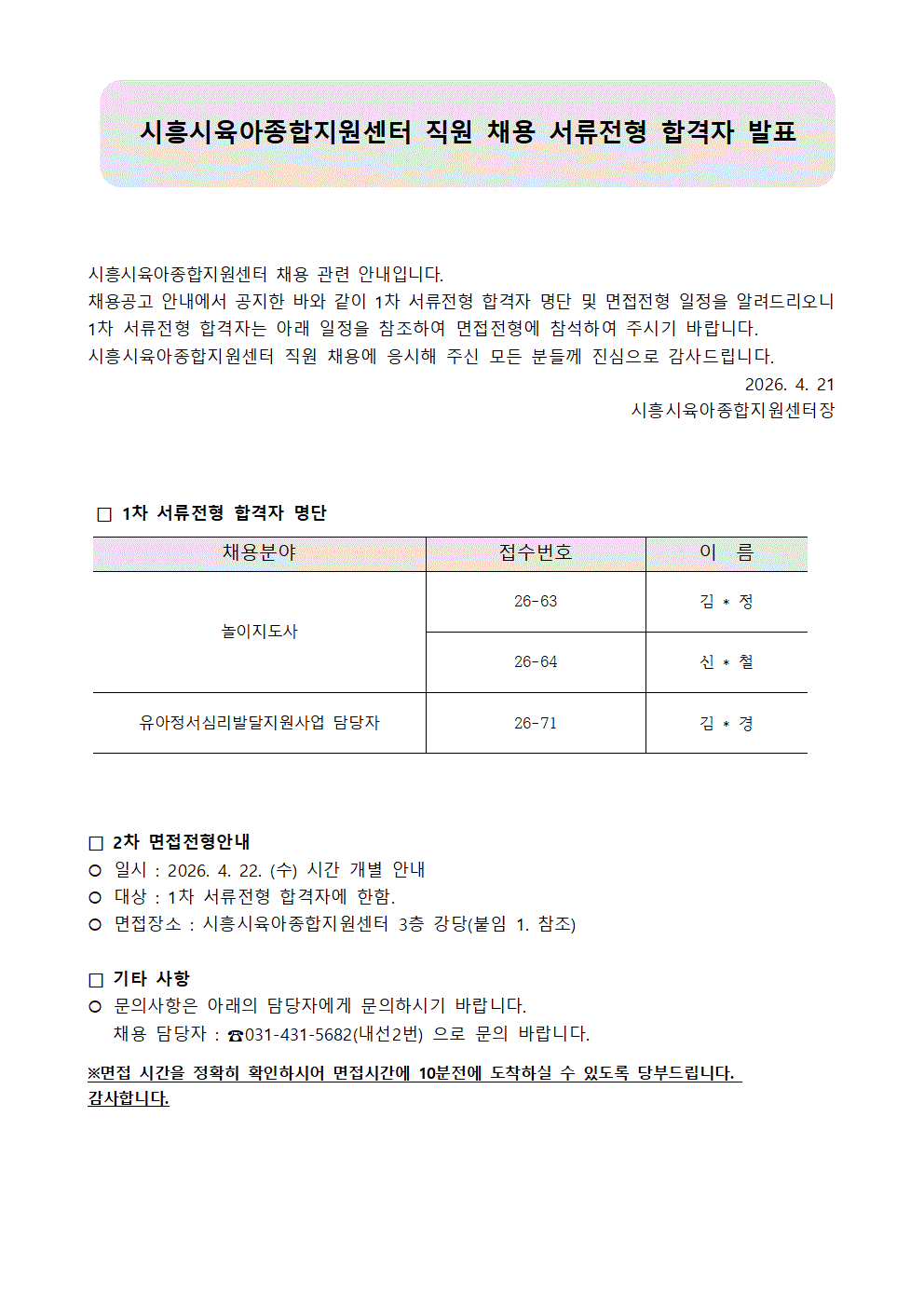[센터] [채용]시흥시육아종합지원센터 직원 1차 서류전형 합격자 공고(놀이지도사,유아정서심리발달지원담당자)