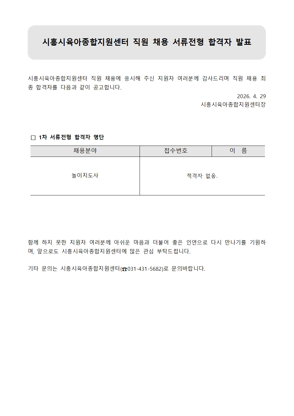 [센터] [채용]시흥시육아종합지원센터 직원 1차 서류전형 합격자 공고(놀이지도사)