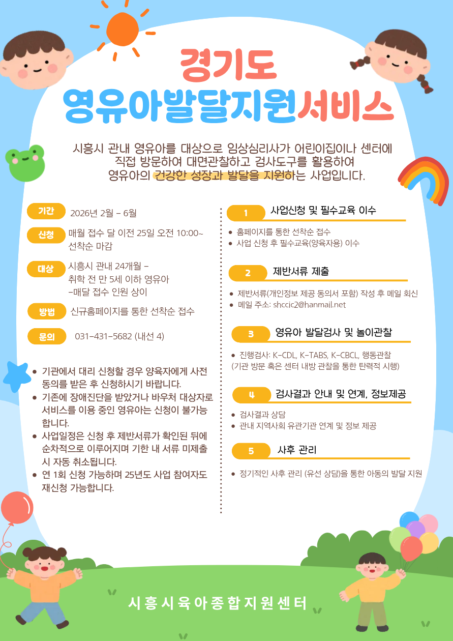 - 가정방문을 희망하는 경우 시흥시영유아통합발달가정방문 사업 (Click!!) 에 신청하시기 바랍니다.